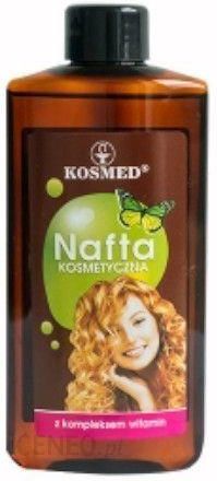 Nafta kosmetyczna z kompleksem witamin 150 mlNafta kosmetyczna z kompleksem witamin poprzez odpowiednio dobrane składniki odżywia włosy, wzmacnia ich strukturę, nadaje im puszystość, przywraca naturalną sprężystość i elastyczność, zapewnia odpowiednie nawilżenie i blask, nadaje fryzurze zdrowy wygląd, miękkość w dotyku oraz połysk. Polecana jest do włosów przetłuszczających się, osłabionych, po zabiegach kosmetycznych, farbowanych i tlenionych. Wspomaga nawet leczenie łupieżu, zapobiega wypadaniu włosów, wzmacnia ich cebulki.Witamina A odpowiedzialna jest za poziom nawilżenia włosów oraz ich odporność na łamanie, wzmacnia włosy oraz zabezpiecza przed utratą wilgoci.Witamina E sprawia, że włosy stają się bardziej elastyczne, sprężyste i miękkie. Zapobiega szkodliwemu działaniu wolnych rodników.Witamina F (niezbędne kwasy tłuszczowe NKT) powoduje tworzenie się płaszcza lipidowego –naturalnej ochrony na skórze i włosach.Witamina H (Biotyna) bywa nazywana witaminą piękna, ponieważ pomaga uporać się z takimi problemami jak: łupież, wypadanie i siwienie włosów. Zapobiega wzmożonej aktywności gruczołów łojowych powodujących kłopoty ze skórą i przetłuszczającymi włosami. Wspomaga leczenie łysienia i chorób skórnych.Sposób użycia:Do użytku zewnętrznego. Niewielką ilość nafty wetrzeć we włosy. Po 15 minutach włosy umyć szamponem. Maseczka: 1 – 2 żółtka jaja kurzego wymieszać z 1 łyżką stołową nafty dodając sok z 1/2 cytryny. Tak sporządzoną maseczkę wmasować we włosy pozostawiając ją na 5-15 minut, a następnie umyć włosy szamponem.InformacjeSeria KOSMED – Nafta Kosmetyczna
